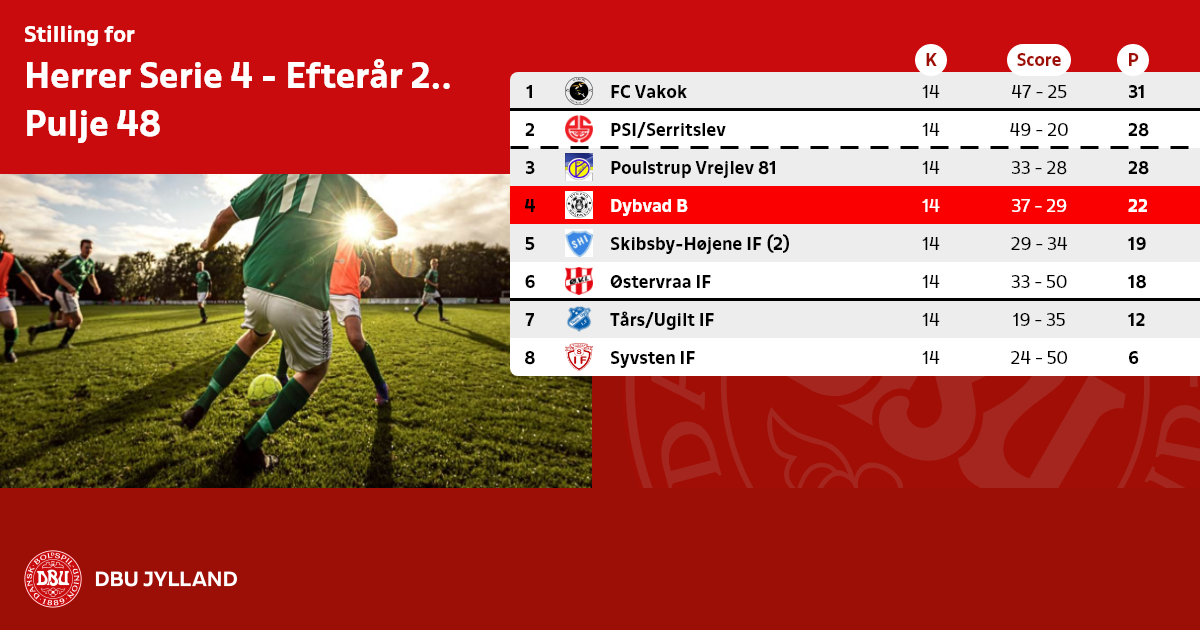 Læs mere om op- og nedrykning, samt Play-off kampe her: https://dbujylland.dk/turneringer-regler/dbu-jylland-turneringer/11m-ungdom-senior-og-u13-liga-raekker/raekkebeskrivelser/herrer/