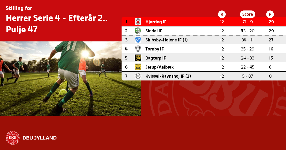 Læs mere om op- og nedrykning, samt Play-off kampe her: https://dbujylland.dk/turneringer-regler/dbu-jylland-turneringer/11m-ungdom-senior-og-u13-liga-raekker/raekkebeskrivelser/herrer/